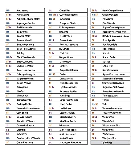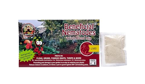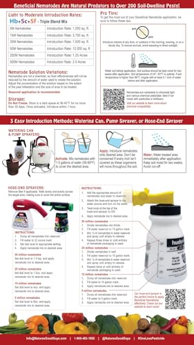 Natures Good Guys, Soldier Bugs Each package contains a mixture of 3 species of nematodes:+Hb (Heterohabditis bacteriophora) +Sc (Steinernema carpocapsae) +Sf (Steinernema feltiae) Triple Blend Beneficial Nematodes work on; Japanese Beetles, Thrips, Maggots, Lawn Grubs, Fungus Gnats, Chiggers, Moths, Fleas, Flea Beetles, Ants (Queen), Asparagus Beetles, Armyworms, Artichoke Plume Moths, Bad Nematodes, Bagworms, Banana Moths, Banana Weevils, Berry Root Weevils, Beet Armyworms, Berry Root Weevils, Bill Bugs, Black Vine Weevils, Black Cutworms, Bluegrass Weevils, Borers, Cabbage Maggots, Carpenter Worms, Borers –Iris, Tree, Vine, Carrot Weevils, Caterpillars, Chafers, Chinch Bugs, Citrus Weevils, Codling Moths, Chafers, Citrus Weevils, Colorado Potato Beetles, Corn Root Worms, Corn Borers, Corn Earworms, Cotton Bollworms, Cranberry Girders, Cranberry Root Weevils, Crane Fly Larvae, Crambids, Crate Flies, Cucumber Beetles, Cutworms, European Chafers, Fall Armyworms, Flea Beetles, Fleas –Adult, Fly Larvae, Fire Ants, Fleas, Fly Larvae, Fungus Gnat, Fruit Flies, Gall Midges, Girdlers, Grape Root Borers, Grubs, Gypsy Moths, Humpbacked Flies, Hylobius Weevils, Japanese Beetles, June Bugs, Large Pine Weevils, Lawn Grubs, Leaf Miners, Leather Jackets, Masked Chafer, May/June Beetles, Mint Borers, Mint Flea Beetles, Mint Root Borers, Mole Crickets, Mushroom Fly Larvae, Navel Orange Worms, Onion Maggots, Pill Worms, Poplar Clear Wig Borers, Raspberry Crown Borers, Roaches, Root Aphids, Rootknot Galls, Root Weevils, Scarabs, Sclarids, Shore Flies, Sod Webworms, Squash Vine Borer Larvae, Subterranean Termites, Strawberry Root Weevils, Sugar Cane Stalk Borers, Sweet Potato Weevils, Termites, Thrips, Ticks, Tobacco Budworms, Tobacco Cutworms, Webworms, Weevil Grubs, Wireworm Aphids, Wireworms, Wood Borers, Wooly Aphids and More!Check the "Guide" under images to determine which nematodes you need ++Hb (Heterohabditis bacteriophora) ++Sc (Steinernema carpocapsae) ++Sf (Steinernema feltiae) Guaranteed Fresh and Alive! Check the "Pest Guide" under images to determine which nematodes you need